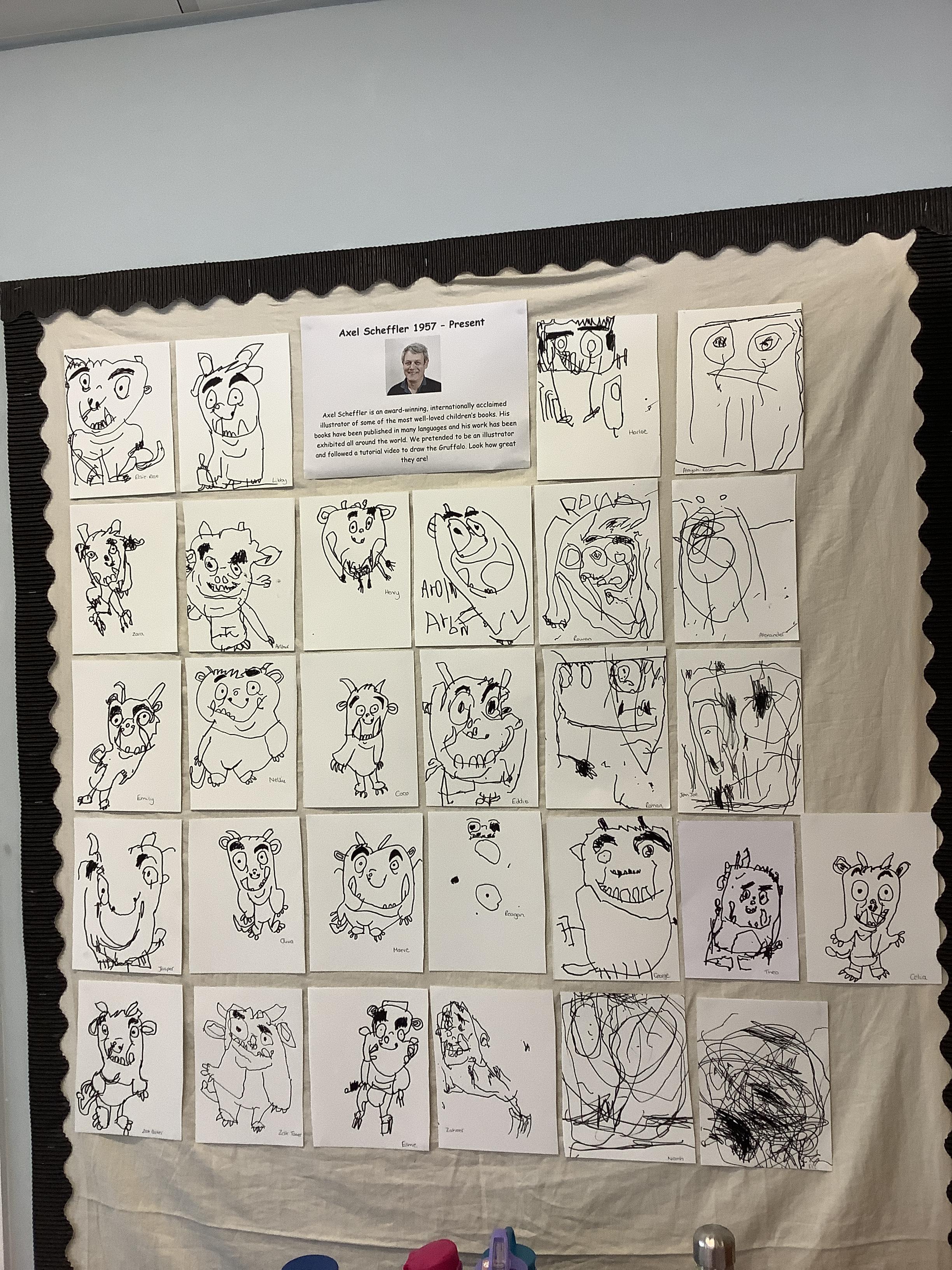 The illustrations in the books are just fantastic, so we decided to try and be an illustrator, just like Axel Scheffler and the results are amazing!! Apple Tree sat down with their clipboard and pen and followed a tutorial to draw their very own Gruffalo!! Take a look at how wonderful they are!