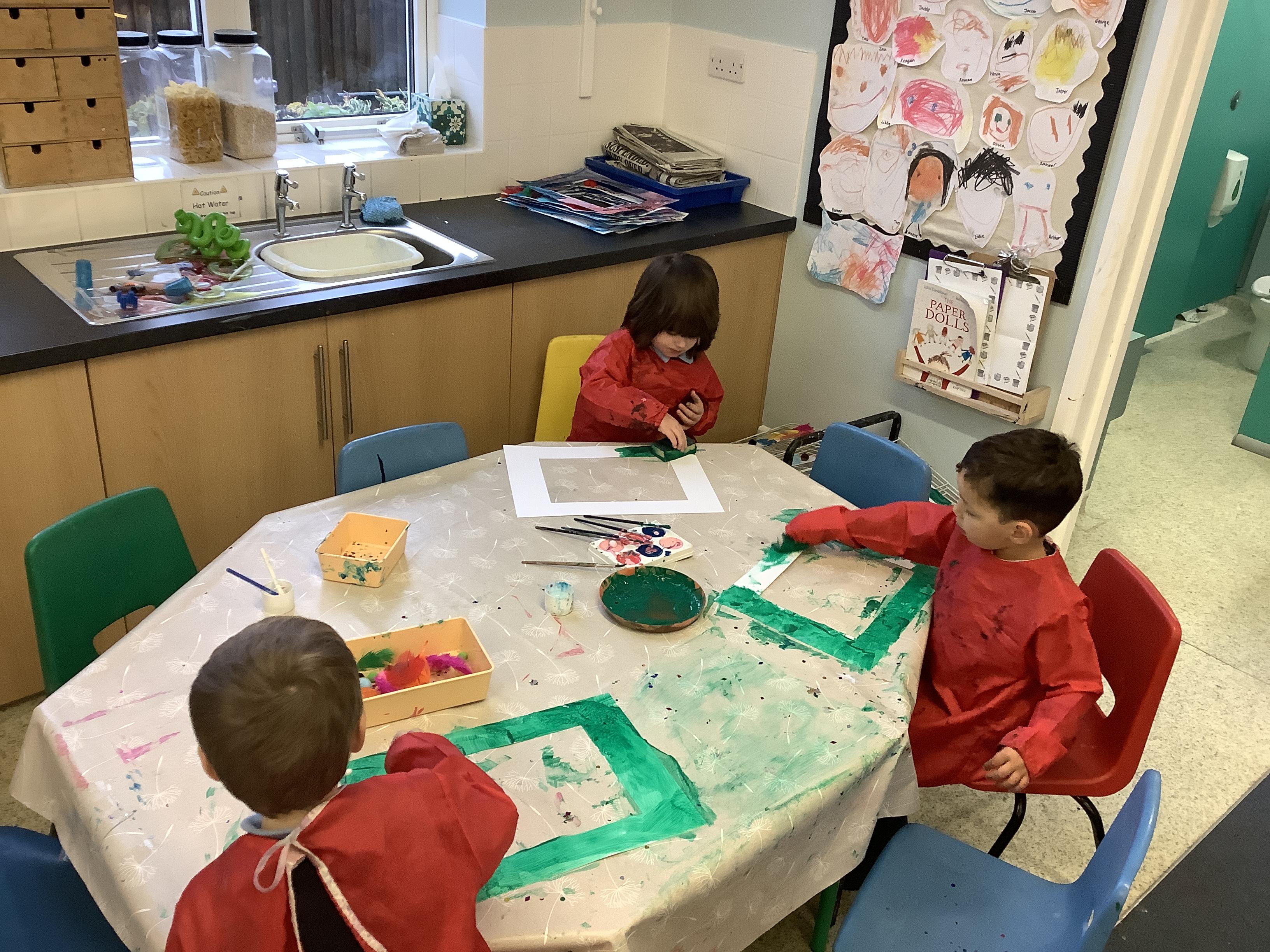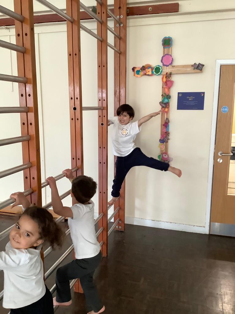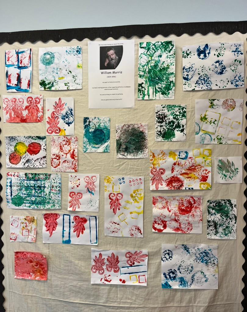 Gymnastics has been thoroughly enjoyed in PE and their confidence on the bars and equipment has grown each week. They have used a printing technique as their Art focus this term, like William Morris used in his artwork. William Morris lived locally to Oxfordshire and often used repeating patterns in his work. They thought of different objects they could print with, like Duplo and pine cones, and learnt that print means to make a copy. They tried their hardest to use a repeating pattern, just like William Morris and created some wonderful art!